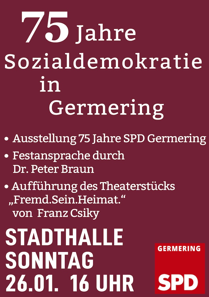 Zum 75-jährigen Jubiläum des SPD Ortsvereins Germering veranstalten wir einen Festakt. Festredner wird der Germeringer SPD-Alt-OB Dr. Peter Braun sein, der auf 75 Jahre SPD in Germering zurückblickt. Außerdem wird das Theaterstück Fremd.Sein.Heimat von Franz Csiky zum Thema "Flucht" aufgeführt, eine Ausstellung über 75 Jahre Sozialdemokratie in Germering zu sehen sein und eine Broschüre mit dem Titel "75 Jahre SPD Germering - Protokoll einer gemeinsamen Geschichte vorgestellt". Für das leibliche Wohl ist gesorgt. Den ganzen Einladungstext finden Sie hier.